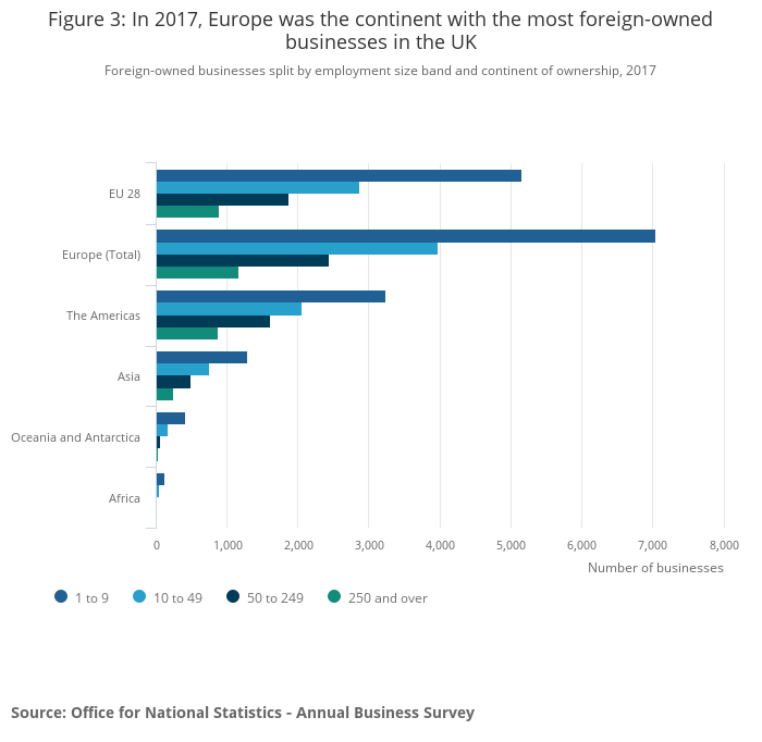 - Europe remains the continent with the most foreign-owned businesses in the UK