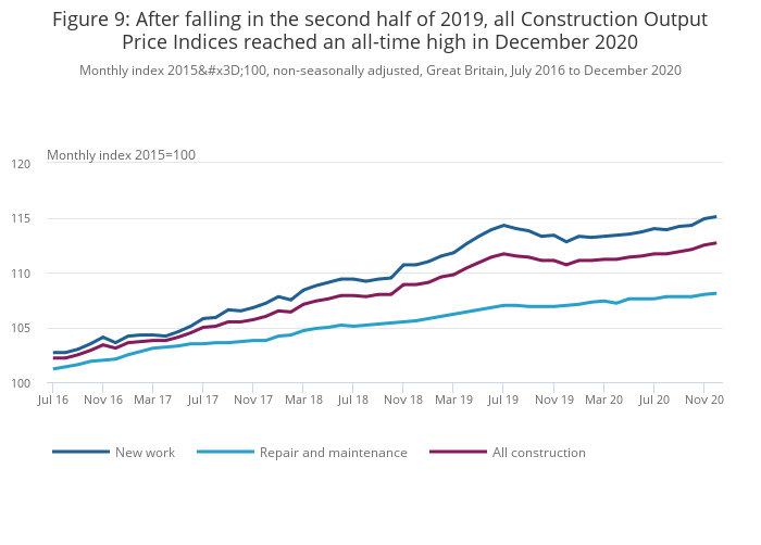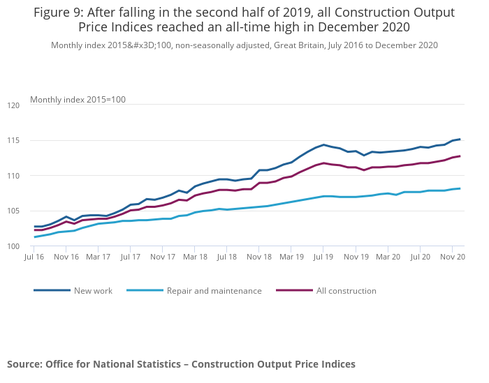 Figure 9: After falling in the second half of 2019, all Construction Output Price Indices reached an all-time high in December 2020