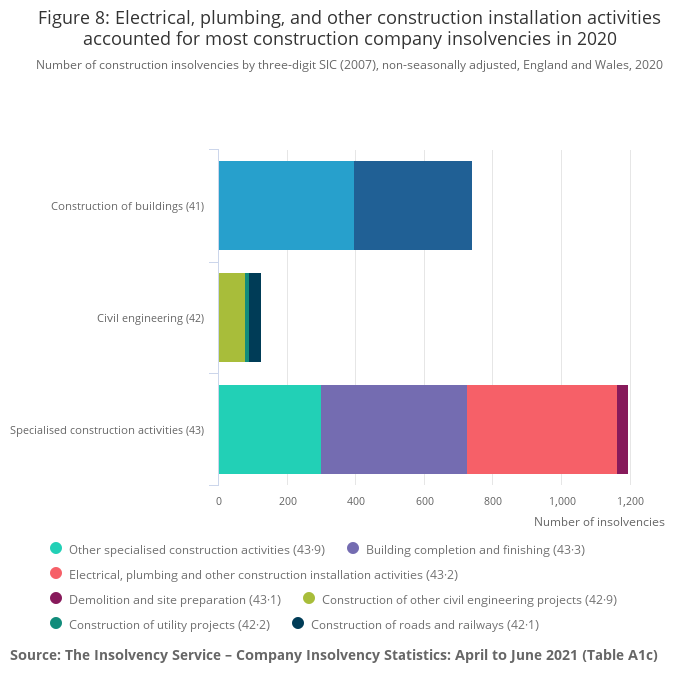 Number of construction insolvencies by three-digit SIC (2007), non-seasonally adjusted, England and Wales, 2020