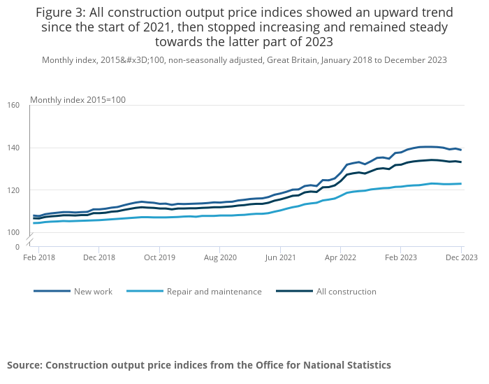Download this chart Figure 3: All construction output price indices showed an upward trend since the start of 2021, then stopped increasing and remained steady towards the latter part of 2023
