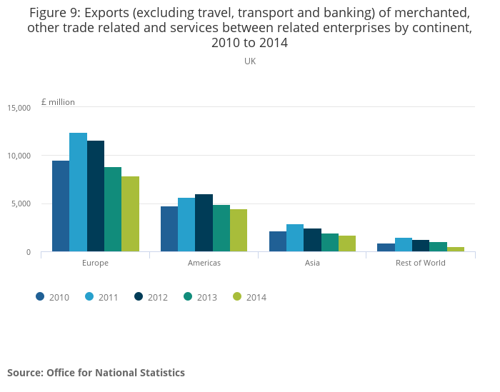 UK exports to the Americas of merchanting, other trade related and services between related enterprises also experienced a decline in 2014, falling from £4,894 million in 2013 to £4,458 million in 2014. The USA experienced the largest decline, falling from £4,505 million in 2013 to £4,094 million in 2014.