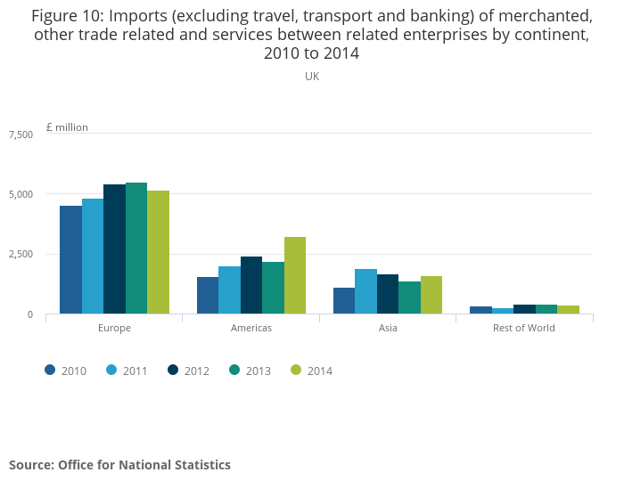 Download this chart Figure 10: Imports (excluding travel, transport and banking) of merchanted, other trade related and services between related enterprises by continent, 2010 to 2014