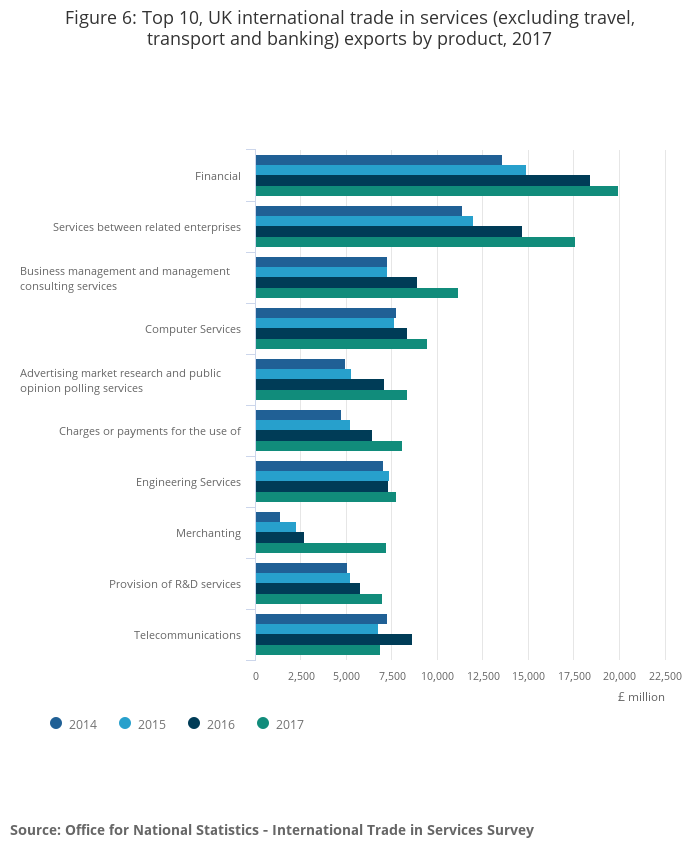 - Financial services were the largest UK services export in 2017
