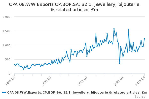 Download this time seriesCPA 08:WW:Exports:CP:BOP:SA: 32.1. Jewellery, bijouterie & related articles: £m