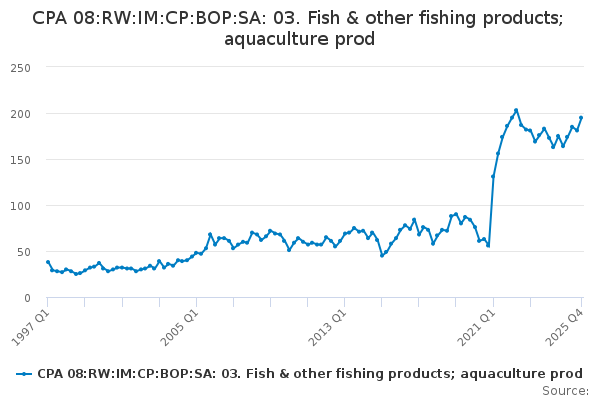 Download this time seriesCPA 08:RW:IM:CP:BOP:SA: 03. Fish & other fishing products; aquaculture prod