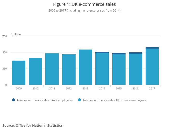 There has been a sharp rise in e-commerce sales by businesses with 10 employees or more, from £484 billion in 2016 to £560 billion in 2017 (Figure 1). This rise of 16% is the largest since 2011.