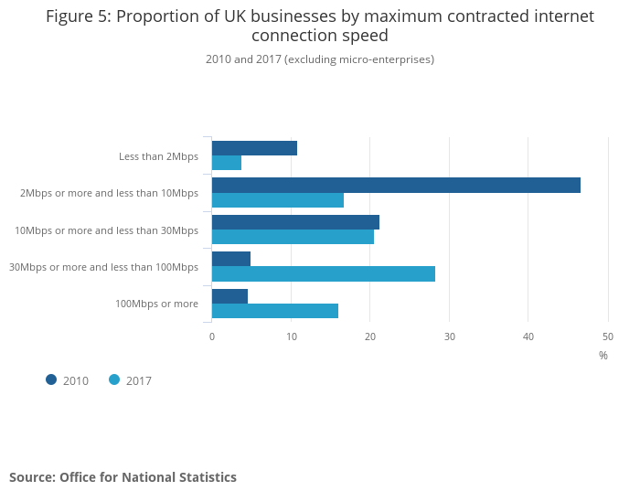 Image .csv .xlsOnly 3.8% of businesses with 10 employees or more had internet speeds less than 2 Mbps in 2017, down from 11% in 2010. In contrast, broadband speeds of more than 100 Mbps were used by 16% of businesses with 10 employees or more in 2017, up from 4.6% in 2010.