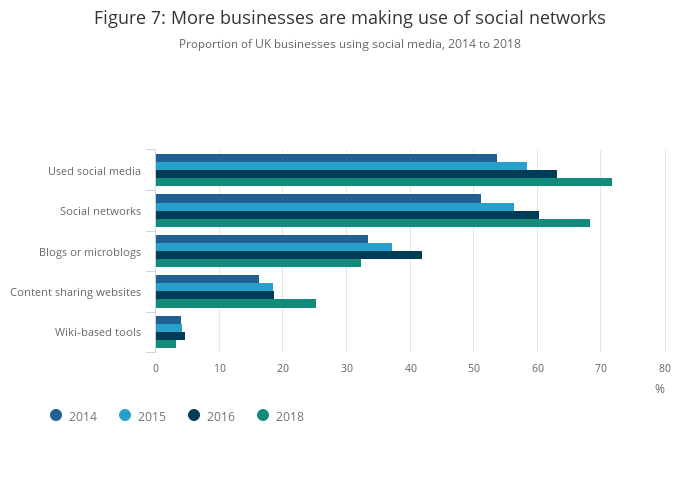 In 2018, social media in some form was used by 72% of UK businesses with 10 or more employees, increasing by 8.6 percentage points since 2016 (Figure 7). The most popular type of social media used was social networks, with 68% of businesses with 10 or more employees using them. Other types of social media, such as blogs, content sharing networks and wiki-based tools, were much less popular, at 32.4%, 25.3% and 3.3% respectively.