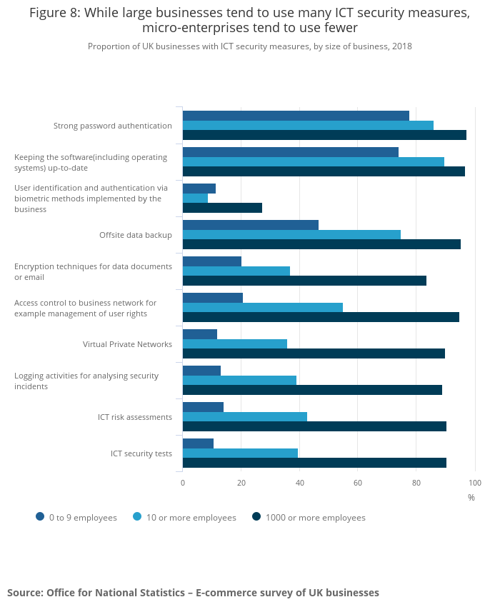 Proportion of UK businesses with ICT security measures, by size of business, 2018