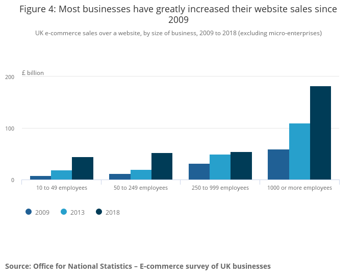 In 2018, businesses with 1,000 or more employees continued to dominate website sales, making up half of the total UK value. These businesses also saw the largest growth in website sales from 2009, growing from £60 billion to £182 billion in 2018. This was a growth of 204%. Smaller businesses also saw large growth, with website sales by businesses with 10 to 49 employees rising from £7.8 billion to £44.1 billion in the same period, a growth of 465%.