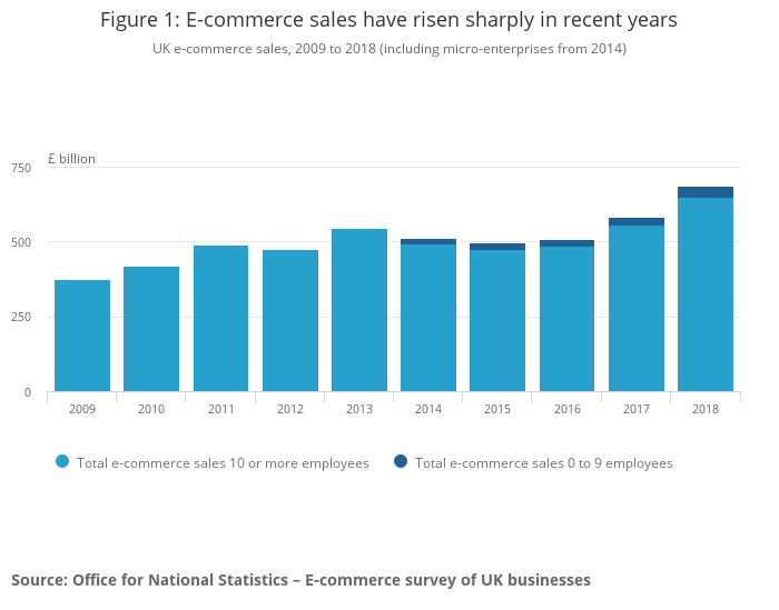 E-commerce sales by businesses in the UK non-financial sector were £688 billion in 2018, rising from £582 billion in 2017; at 18%, this was the largest annual growth seen since comparable records began in 2014.