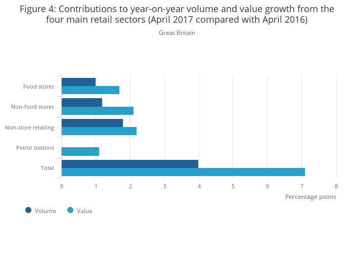 Download this chart Figure 4: Contributions to year-on-year volume and value growth from the four main retail sectors (April 2017 compared with April 2016)