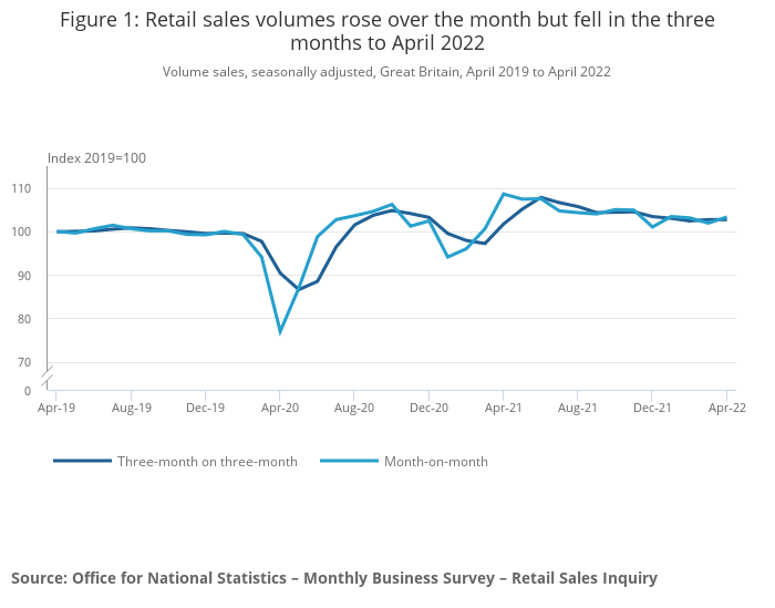 Figure 1: Retail sales volumes rose over the month but fell in the three months to April 2022