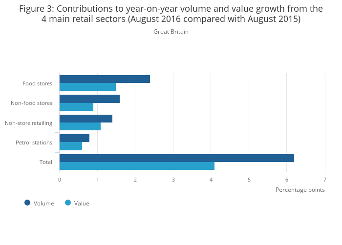 Image .csv .xlsIn August 2016 compared with August 2015, all main retail sectors saw an increase in the quantity bought (volume) and amount spent (value). The largest contribution in the quantity bought and amount spent came from food stores. Average store prices have fallen across all store types in August 2016 compared with August 2015, resulting in consumers buying more goods.
