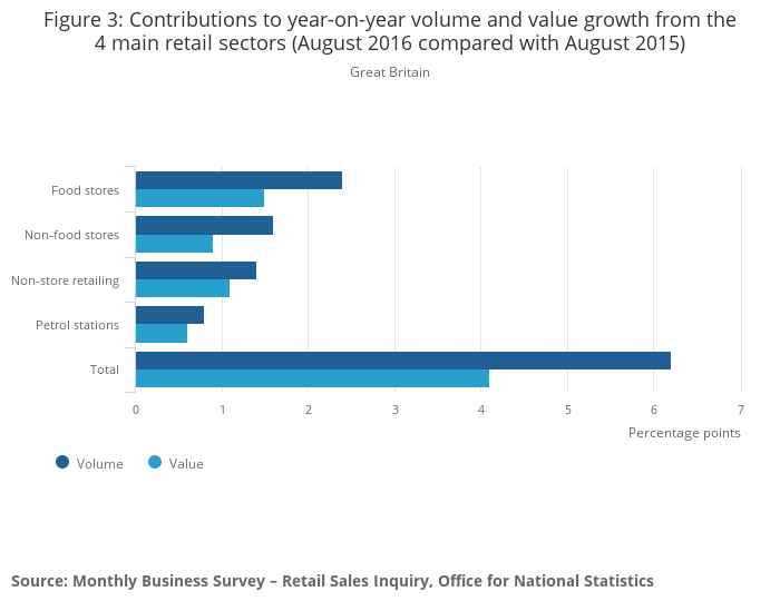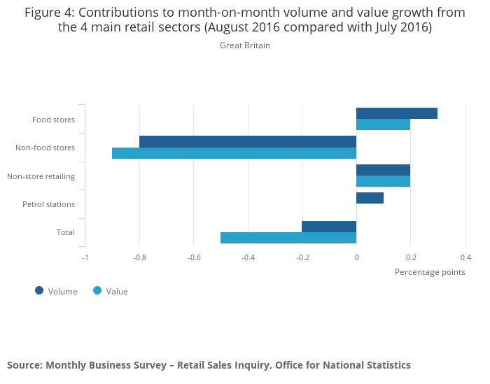 Figure 4: Contributions to month-on-month volume and value growth from the 4 main retail sectors (August 2016 compared with July 2016)