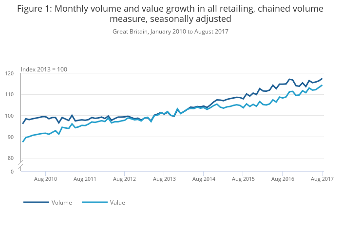 This bulletin presents estimates of the quantity bought (volume) and amount spent (value) in the retail industry for the period 30 July 2017 to 26 August 2017. Unless otherwise stated, the estimates in this release are seasonally adjusted.