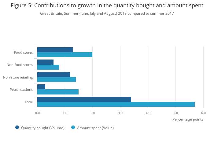 Image .csv .xlsAll main sectors contributed positively to the growth in retail sales during the summer of 2018 when compared with the summer of 2017 (Figure 5). Food stores contributed most to the growth reported in both the amount spent and the quantity bought, with retailers within the sector commenting on strong sales linked to the good weather and a further boost due to the FIFA World Cup, which ran from 14 June to 15 July.