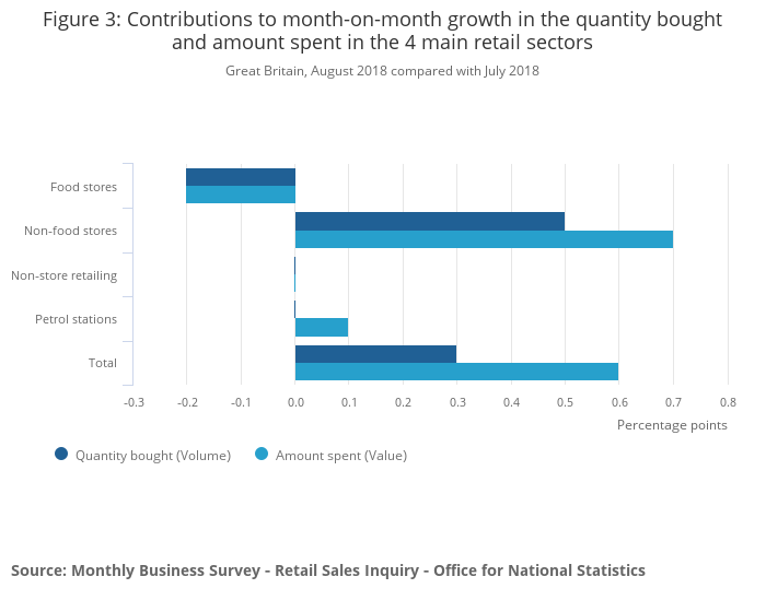 The last three months of summer from June to August 2018 saw an increase in the quantity bought at 3.4%, with food and household goods stores doing well in the warm weather when compared with the previous summer, while non-store retailing continued to show strong growth.