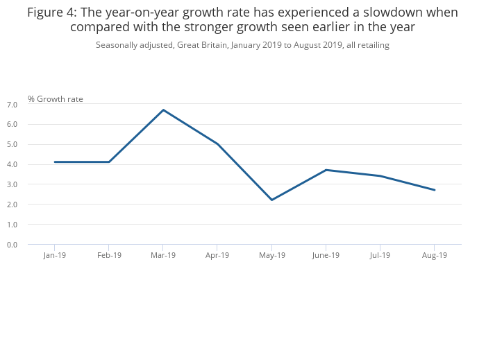 In January 2019, a year-on-year growth rate of 4.1% was reported, which peaked to 6.7% in March 2019. Strong growth was reported in all four main sectors in March 2019 when compared with March 2018, when snow resulted in many road closures (see the March 2018 retail sales bulletin).