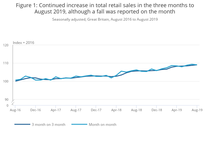 Figure 1: Continued increase in total retail sales in the three months to August 2019, although a fall was reported on the month
