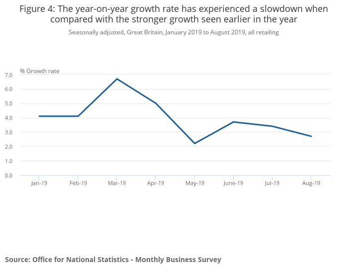 When compared with a year earlier, both the amount spent and quantity bought showed strong growth of 3.4% and 2.7% respectively in August 2019; this growth is a slowdown to the strength experienced earlier in the year.