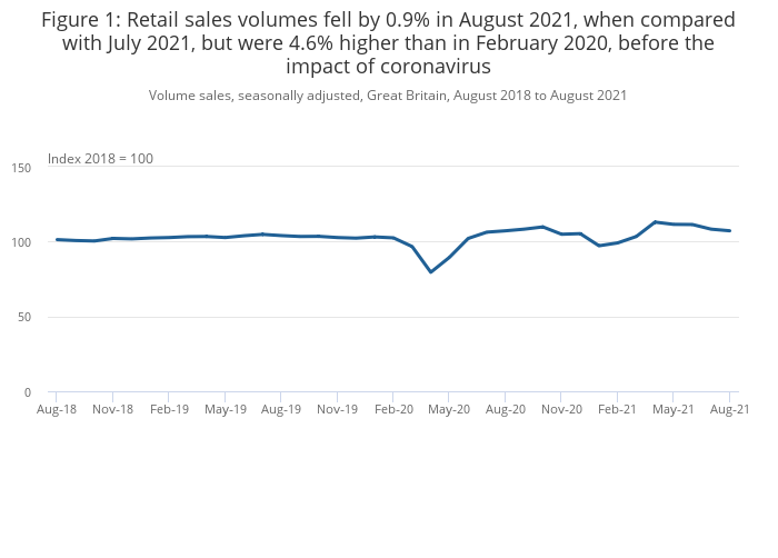 Retail sales volumes fell by 0.9% in August 2021, following a 2.8% fall in July; however, volumes were up by 0.3% in the three months to August compared with the previous three months, and in August 2021 were 4.6% higher than their pre-coronavirus (COVID-19) pandemic February 2020 levels.
