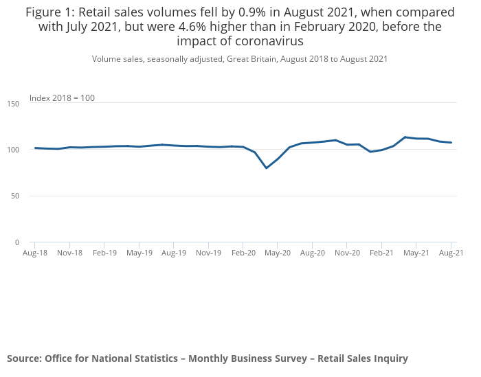 Retail sales volumes fell by 0.9% in August 2021, following a 2.8% fall in July; however, volumes were up by 0.3% in the three months to August compared with the previous three months, and in August 2021 were 4.6% higher than their pre-coronavirus (COVID-19) pandemic February 2020 levels.