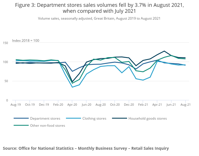 Figure 3: Department stores sales volumes fell by 3.7% in August 2021, when compared with July 2021