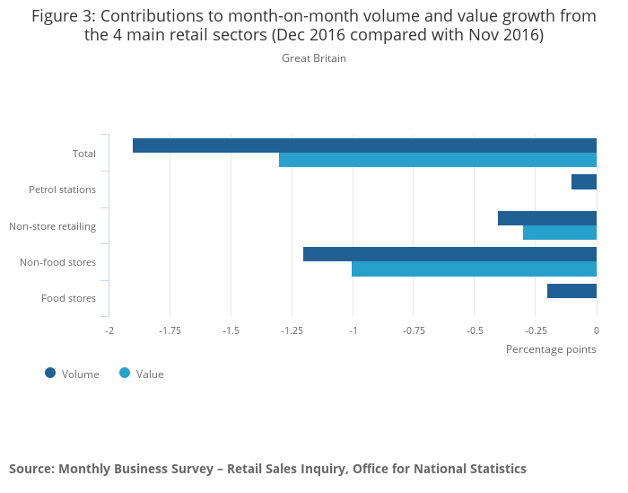Figure 3: Contributions to month-on-month volume and value growth from the 4 main retail sectors (Dec 2016 compared with Nov 2016)