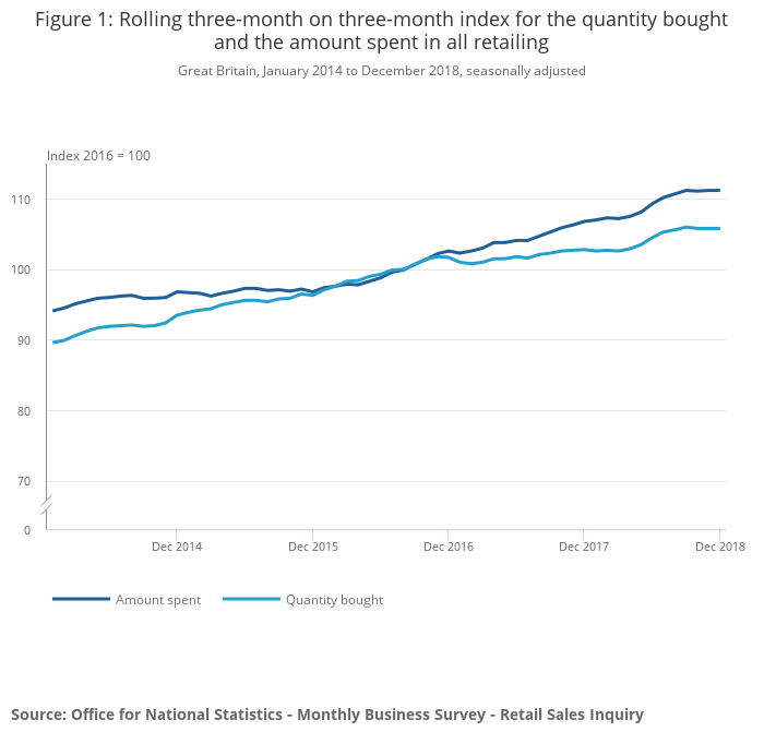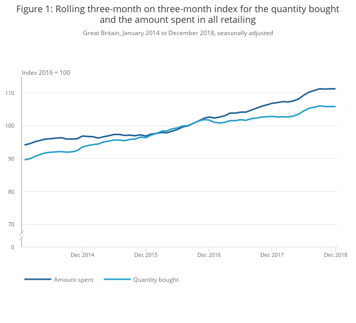 From January 2014, the trend in the amount spent remained relatively flat as the quantity bought increased at a faster rate up to January 2016. Sales began to increase at a stronger rate of growth from January 2016 for both the amount spent and quantity bought. From January 2017, the amount spent continued to increase at a steady rate, while the quantity of goods bought slowed to increase at a slower pace. The warm summer months from May 2018 to July 2018 saw increased retail sales as both the amount spent and quantity bought showed a sharper increase during this period. In later months, from September 2018, growths for both measures were flat to December 2018.