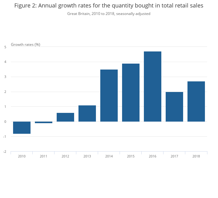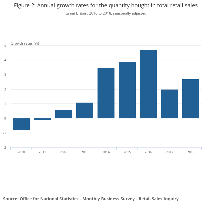 In 2018, the quantity bought in retail sales increased by 2.7% (Figure 2).