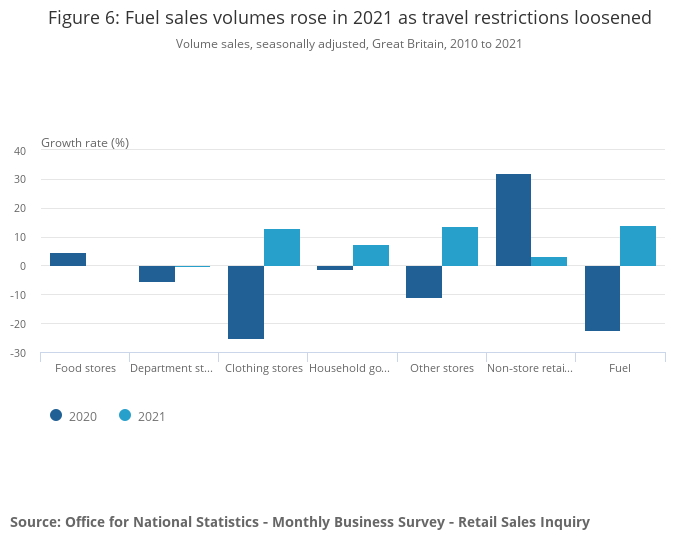 Image .csv .xlsFuel sales volumes rose 14.1% in 2021 from a fall of 22.3% in 2020 when travel restrictions and work from home guidance reduced the demand for fuel. Other non-food stores and clothing stores also recorded large increases of 13.8% and 13.1% following the re-opening of non-essential retail.