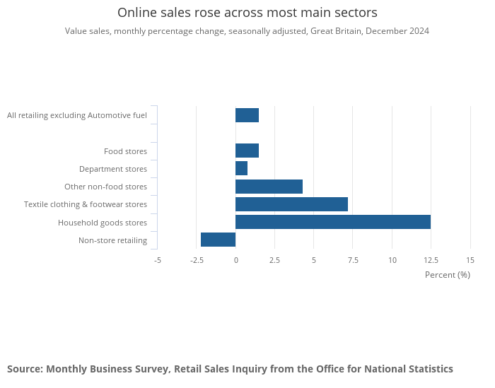 This fall was partly offset by a rise in non-food stores sales volumes (the total of department, clothing, household and other non-food stores) which increased by 1.1% over the month. Clothing stores had the largest upward contribution, rising by 4.4% in December, rebounding from falls of 3.5% in November 2024 and 3.3% in October 2024. Department stores and household goods stores also rose over the month which retailers attributed to stronger Christmas sales.