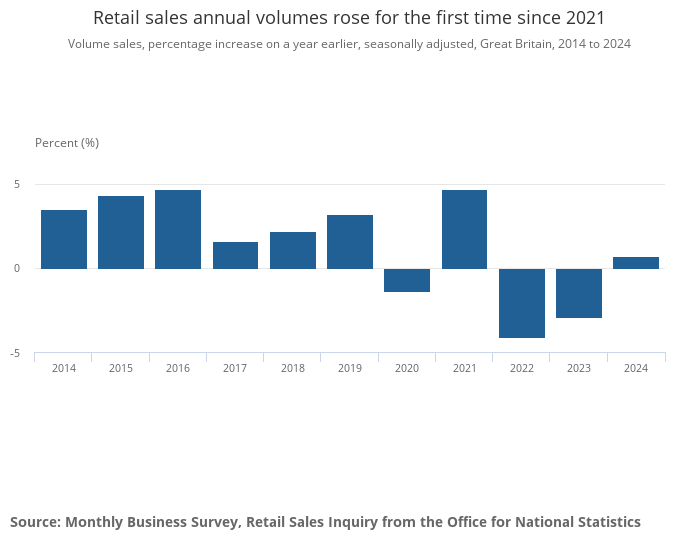 Image .csv .xlsRetail sales volumes rose by 0.7% in 2024, following a fall of 2.9% in 2023 and of 4.1% in 2022. Although this marked the first rise in three years, sales volumes have not returned to 2022 levels.