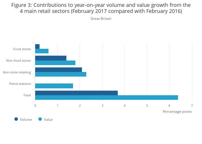 Download this chart Figure 3: Contributions to year-on-year volume and value growth from the 4 main retail sectors (February 2017 compared with February 2016)