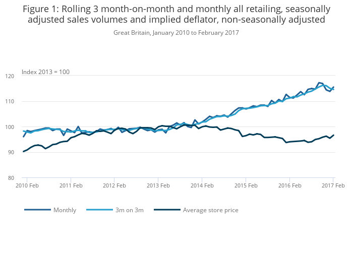 - Estimates of the quantity bought in retail sales increased by 3.7% compared with February 2016 and increased by 1.4% compared with January 2017; this monthly growth is seen across all store types.