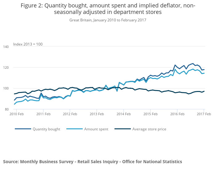 From July 2014 to November 2016, the divergence in the amount spent and volume bought suggests that consumers began to buy more products during a period of 29 consecutive year-on-year price falls. January 2017 saw the first fall in year-on-year growth in the quantity bought since April 2013 and the first fall in the amount spent since January 2015, which coincided with a rise in average store price, suggesting that consumers are buying less in department stores as prices increase.