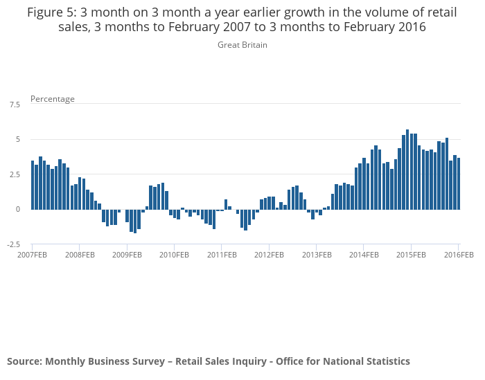 Figure 5: 3 month on 3 month a year earlier growth in the volume of retail sales, 3 months to February 2007 to 3 months to February 2016