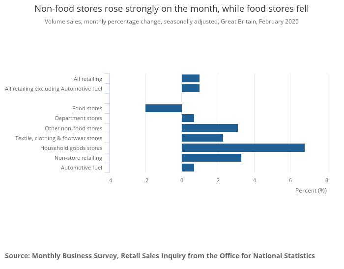 Non-food store sales volumes grew strongly in February 2025, with rises across all four sub-sectors (department, other non-food, clothing, and household goods stores), while supermarket sales volumes fell back following a strong rise in January 2025.