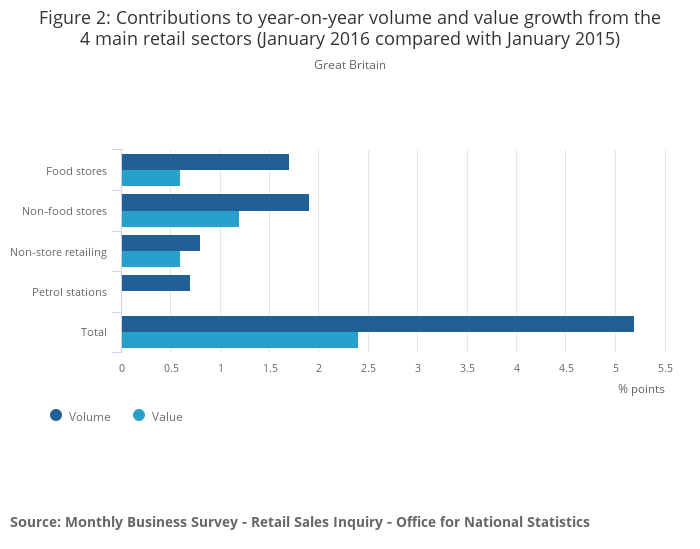 Figure 2: Contributions to year-on-year volume and value growth from the 4 main retail sectors (January 2016 compared with January 2015)