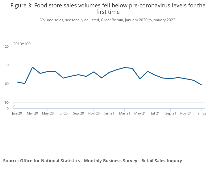 Food store sales volumes in January 2022 fell below pre-coronavirus levels for the first time and were 0.8% below where they were in February 2020.