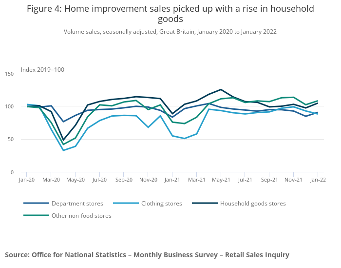 Non-food stores sales volumes rose by 3.4% in January 2022 as home improvement sales volumes picked up with increased sales in household goods and garden centres; non-food sales volumes were 1.1% below their February 2020 levels.