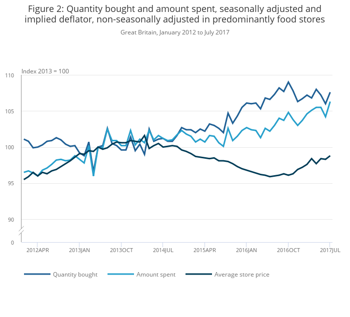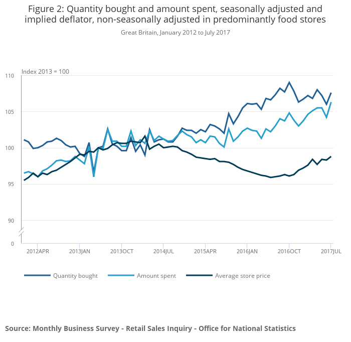 When compared with July 2016, there is an increase in both the quantity bought and amount spent of 0.2% and 3.1% respectively. The relatively low year-on-year growth for the quantity bought may be explained by the increase in average store prices of 2.8% in July 2017 compared with July 2016. This was the largest year-on-year increase in food prices since October 2013.