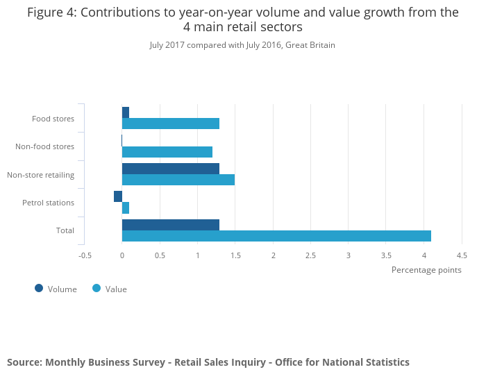 While the quantity bought within non-food stores remained flat on the month, the declines in petrol stations and non-store retailing were offset by the positive contribution to growth in food stores of 0.5%.