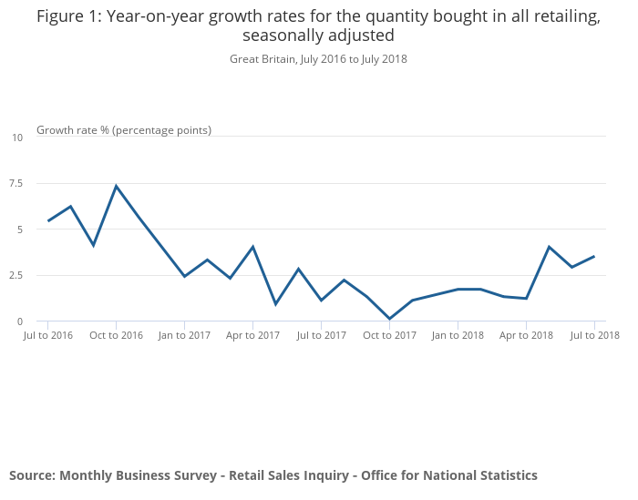 When compared with the same month a year earlier, the quantity bought in July 2018 increased by 3.5% when compared with the slower growth of 1.1% in July 2017.