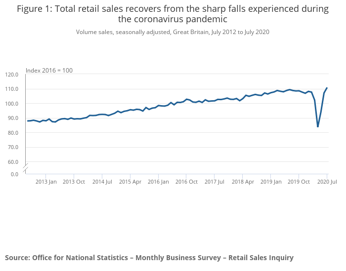 All seasonal adjustment parameters for our volume and value data, for all businesses and internet time series, up to July 2020 have been reviewed. Many series are impacted by coronavirus (COVID-19)-related actions in July 2020 and previous months. Each series has been reviewed and the best adjustment for coronavirus-related effects applied. These may need to be revised further as additional data become available.