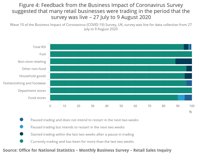 Looking at information gathered from retailers in both the Retail Sales Inquiry and Wave 10 of the Business Impact of Coronavirus (COVID-19) Survey (BICS), which covered the dates 13 to 26 July, most businesses are either currently trading, or started trading in the last two weeks (Figure 4).