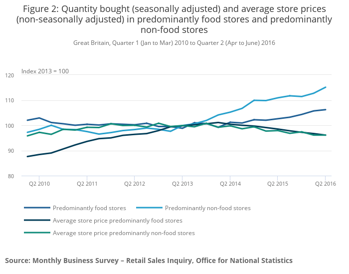 Average prices in food stores increased rapidly during the early part of the time series while the quantity bought stayed fairly static. In more recent periods, as prices have fallen the quantity bought has increased, but not to a significant level. This suggests that, consumers do not necessarily buy more, rather they may change to better quality or more expensive products.