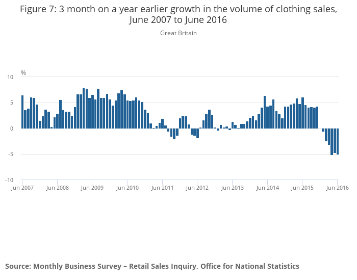 Download this chart Figure 7: 3 month on a year earlier growth in the volume of clothing sales, June 2007 to June 2016