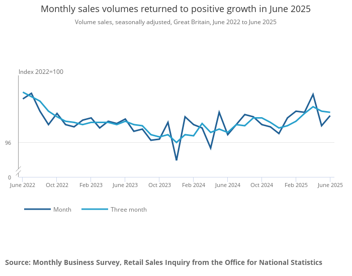 Non-store retailer's sales volumes, which mainly includes online retailers, rose by 1.7% in June 2025, putting sales volumes at their highest level since February 2022. Retailers suggested that promotions and the good weather contributed.